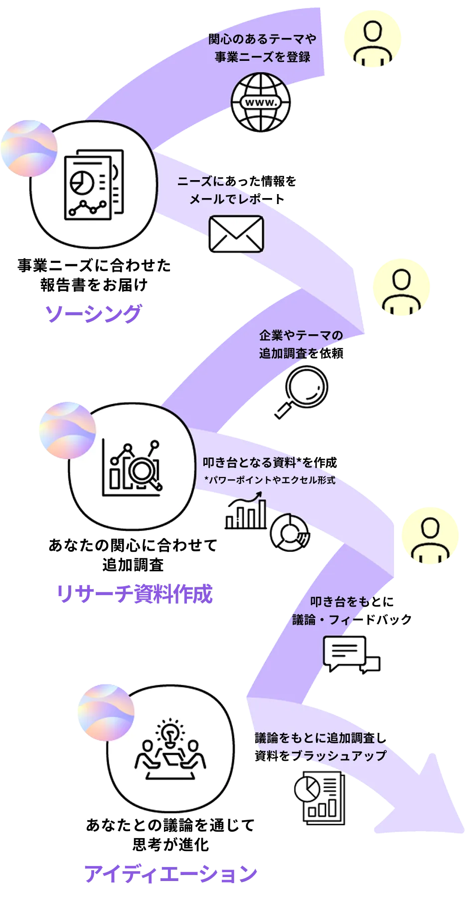 あとは自動で、最新のビジネスやテクノロジーの動向を調査し、具体的な考察を添えて、あなたの事業領域やニーズにパーソナライズしたレポートを定期的にお届けします。